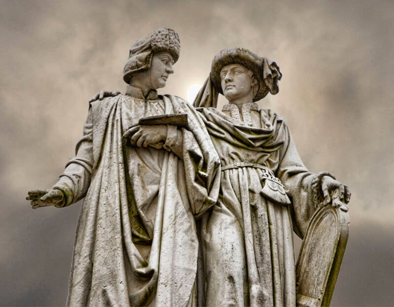 De sculpturen stellen vier personen uit totaal verschillende sociale klassen en van een andere oorsprong voor. Ze steken letterlijk de hoofden bij elkaar, wat symbool staat voor de verbinding van kennis en cultuur die je ervaart bij een bezoek aan de bib.